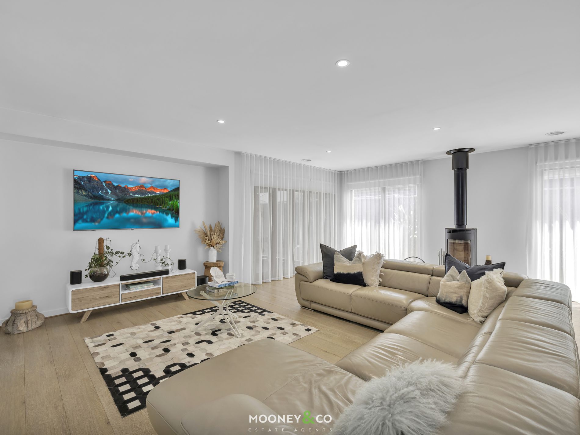 The heart of the home is its open plan living zone - a beautifully balanced space where family life naturally comes together. Sunlight filters through expansive windows, timber flooring flows throughout and the relaxed living room, anchored by a cozy wood heater, is perfect for conversation and connection.