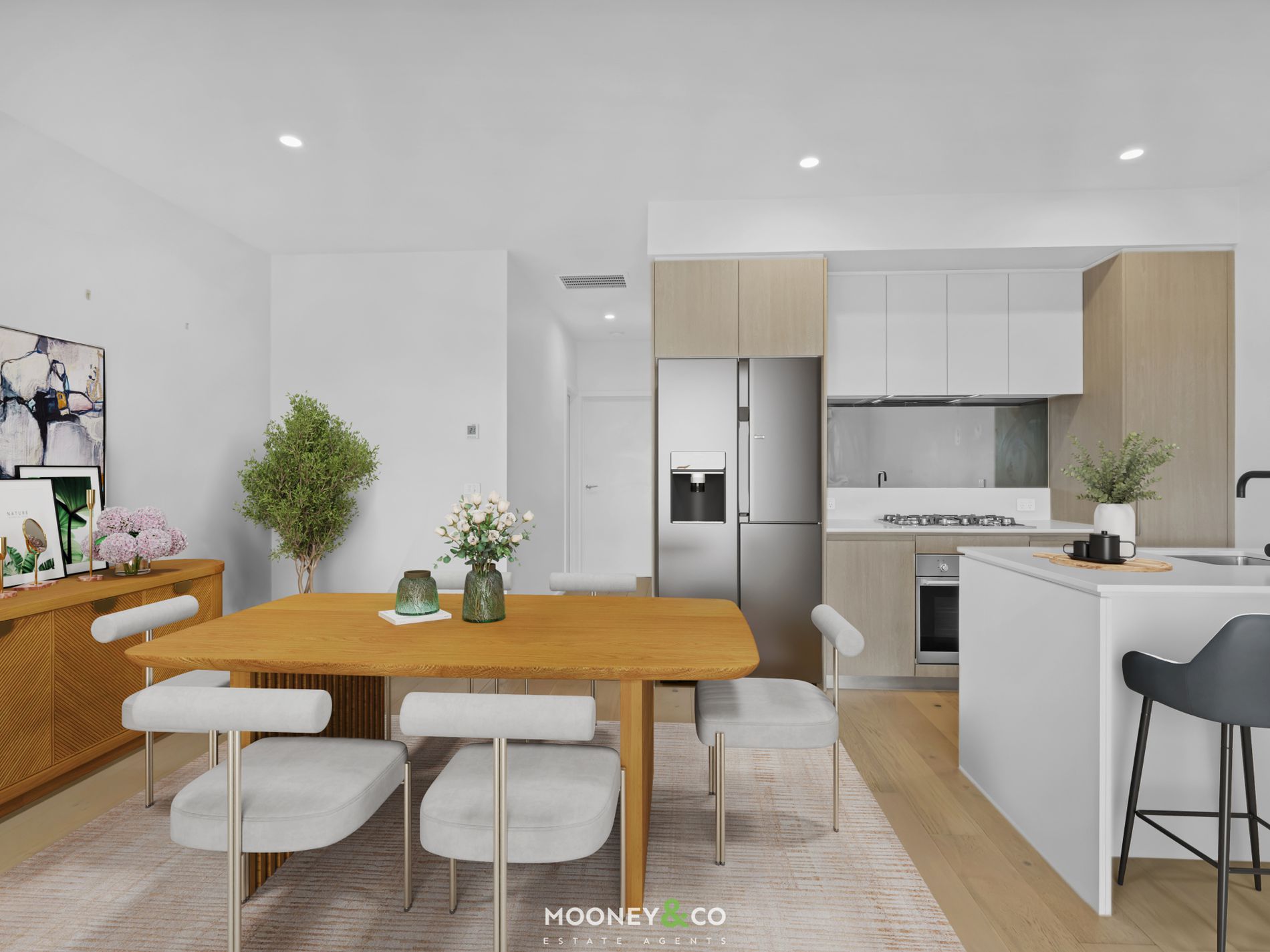 Thoughtfully designed across two light filled levels, the home welcomes you with a spacious open plan kitchen, living and dining zone that forms the heart of the home. The contemporary kitchen features stone benchtops, sleek cabinetry and quality Ilve appliances including a five burner gas cooktop and electric oven, creating a space that is both practical for everyday living and perfect for entertaining.